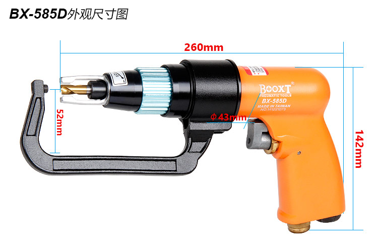 • 產品參數: 夾頭尺寸:M8 空載轉速:650rpm 全 長:260mm 重 量:2.06kg 耗 氣 量:0.55m3/min 【專業型】