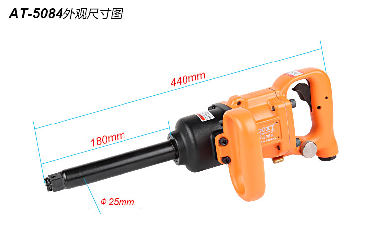 • 產品參數: 螺栓能力:25-30mm; 方頭尺寸:3/4"; 2秒 扭力:1500Nm; 5秒 扭力:2200Nm; 空載轉速:7500rpm; 全 長:440mm; 重 量:5.0kg; 噪 音 值:99.8dB(A); 耗 氣 量:0.6M3/分鐘; 使用工作氣壓:0.65Mpa; 推薦使用內徑13mm氣管; 平時使用應多加氣動油保養