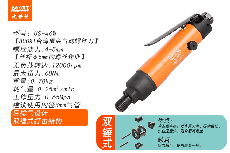 東莞市強勁五金工具有限公司提供臺灣BOOXT波世特品牌氣動工具,氣動螺絲刀US-46W廠家直銷,首件享特價。咨詢熱線:4008301980