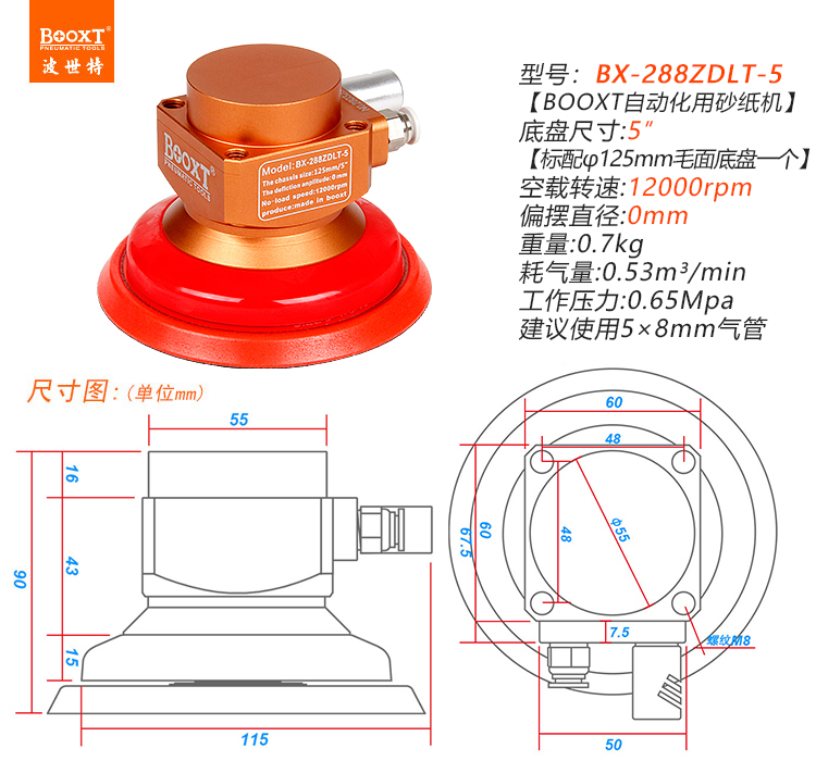 • 產(chǎn)品參數(shù): 底盤尺寸:125mm 【5寸】 偏心尺寸:0mm (同心) 空載轉(zhuǎn)速:12000rpm 重 量:0.7kg 耗 氣 量:0.53m3/min【同心/高速】