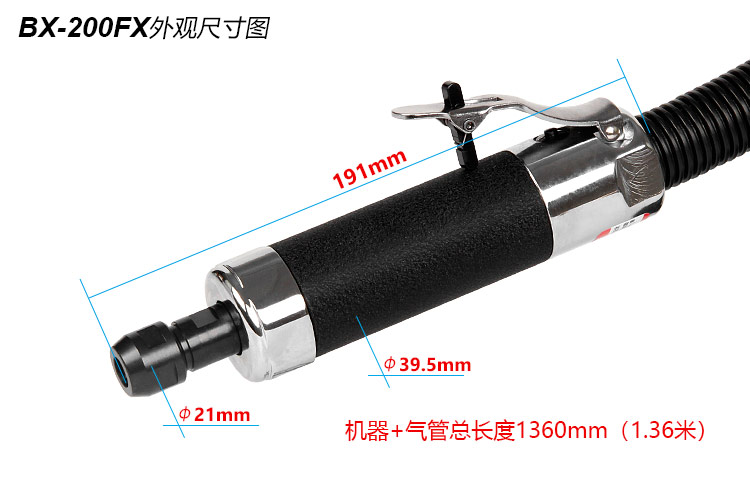 • 產品參數: 夾頭尺寸:標配6mm;選配m3,m8 空載轉速:22000rpm; 工具長度:191mm; 工具重量:1.10kg; 馬達功率:0.6HP; 后排氣; 耗氣量:0.45m3/min; 使用工作氣壓:0.65Mpa; 推薦使用內徑8mm氣管; 平時使用應多加氣動油保養. 【工業型/歐式/帶消音】
