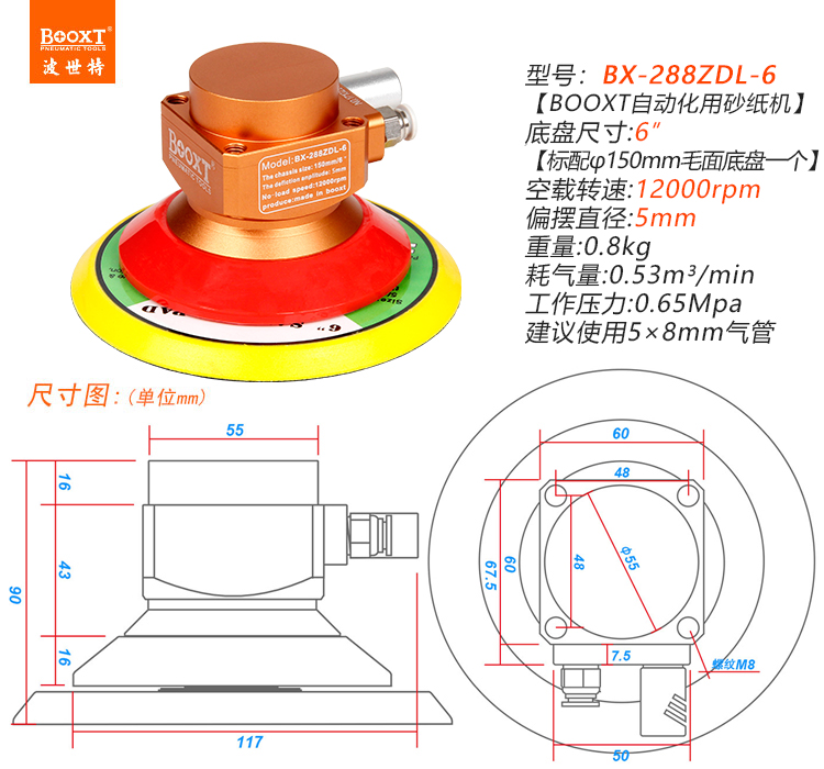 • 產品參數: 底盤尺寸:150mm 【6寸】 偏心尺寸:5mm (同心) 空載轉速:12000rpm 重 量:0.8kg 耗 氣 量:0.53m3/min 【偏心】