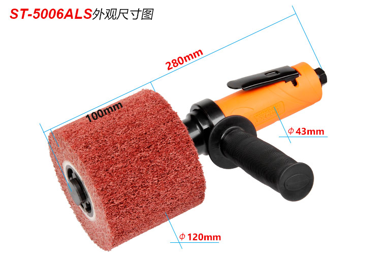 • 產品參數: 拉絲輪直徑:120mm 拉絲輪寬度:100mm 空載轉速:5000rpm 工具全長:280mm 重 量:1.82kg 耗 氣 量:0.48m3/min 【工業型】